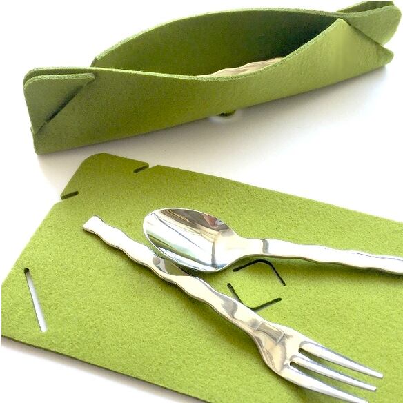 Module Designオリジナルのケーキフォークとティースプーンをティータイム用にセットした〈カトラリーセット〉をデザインしました。1枚のフェルトを差し込むとカトラリーケース、フラットにすればカトラリーマットとして使えます。セットしたところがちょっとしたカフェに。ウォッシャブルフェルトを使用しており清潔を保つことができます。